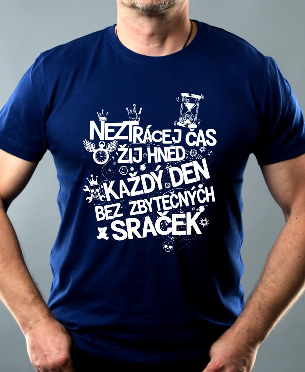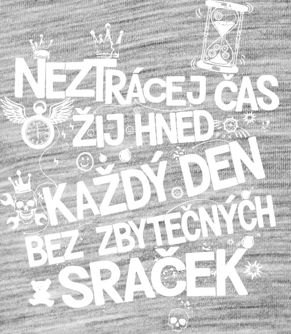 Neztrácej čas, bílý potisk. Rázné připomenutí pro každý den. Motiv s výraznou typografií a nápisem „Neztrácej čas, žij hned“ doplňují rebelské prvky jako lebka a přesýpací hodiny, které jasně říkají, že život je příliš krátký na řešení zbytečností.