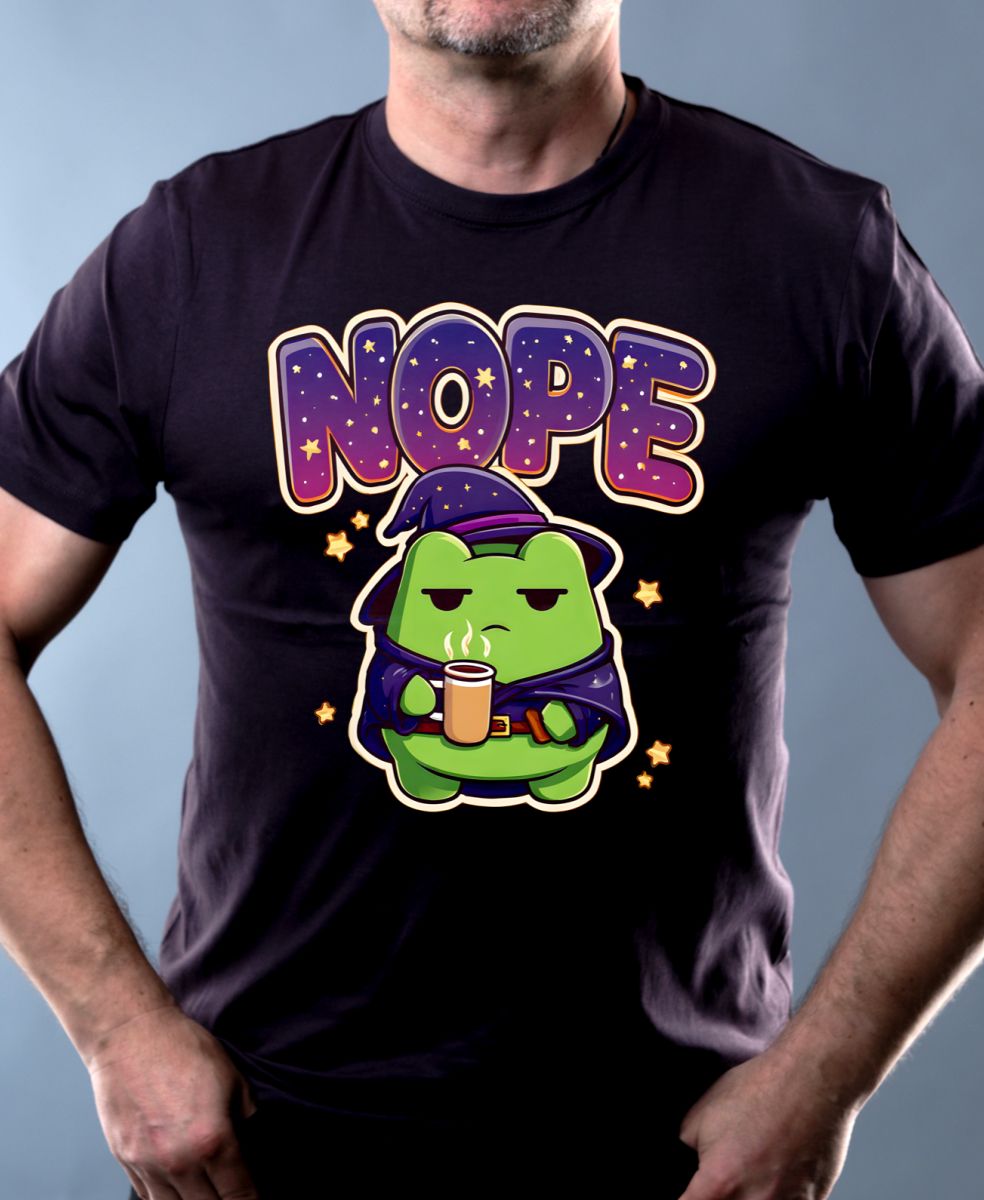 Nope wizard frog. Rozkošná zelená žába v čarodějnickém klobouku, která s šálkem kávy a jasným nápisem „NOPE“ dává světu najevo svou ranní náladu. Ideální motiv pro všechny milovníky kávy a sarkastického humoru, kteří se prostě ještě neprobudili