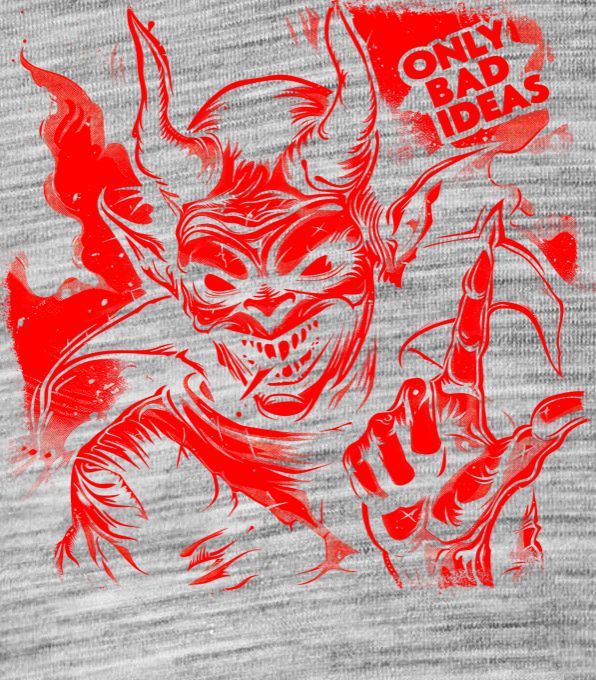 Only Bad Ideas, černý tisk. Ďábel radí jen špatné nápady. Tričko pro ty, co jdou do akce s heslem: Žádné zábrany, jen adrenalin!