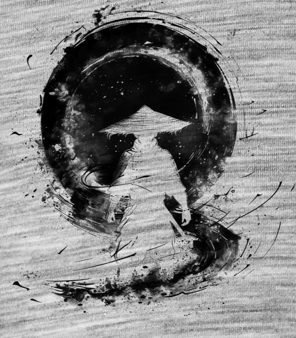 Osamělý válečník, V2, černý tisk. Bojovník uprostřed apokalypsy, připraven na poslední boj pod dramatickým nebem. Temné a dynamické mistrovské dílo pro milovníky akce a temné fantazie.