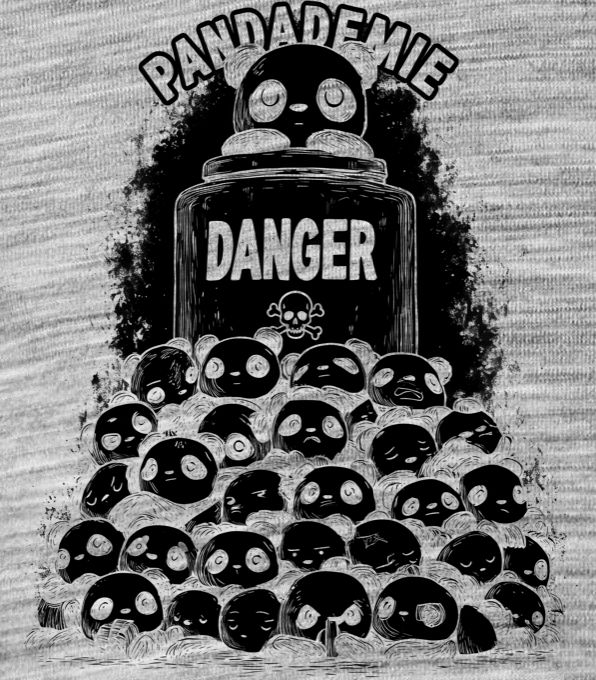Pandademie, černý tisk. Je to cute, ale taky pořádně nebezpečné! Tato hromada rozkošných pand s varovným nápisem “PANDEMIE” je trefnou a vtipnou reakcí na přebytek roztomilosti. Ideální pro ty, kteří milují temný humor a pandy.