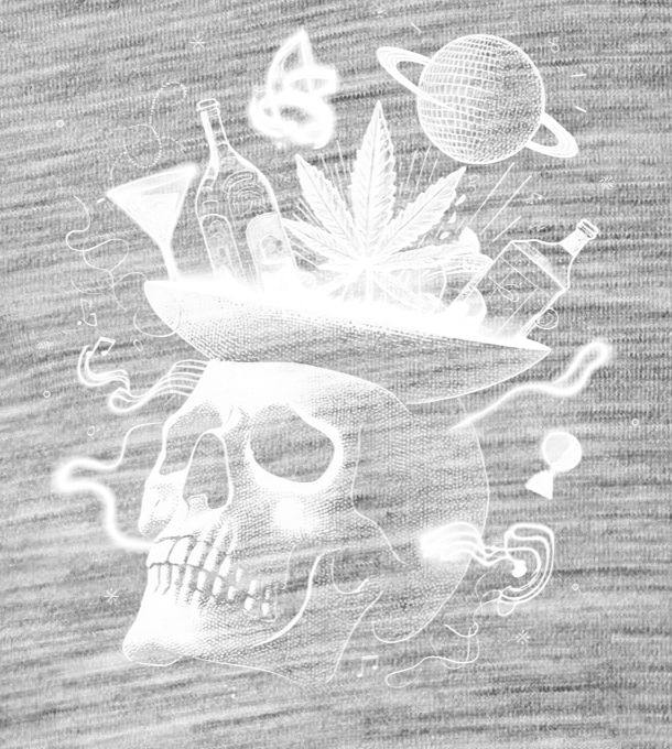 Párty v hlavě, lebka, bílý potisk. Design, který v barevné i černobílé verzi jasně říká, že nuda ve vašem slovníku nemá místo. Ideální kousek pro rebely, co žijí naplno až do morku kostí.