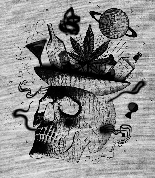 Párty v hlavě, lebka, černý tisk. Design, který v barevné i černobílé verzi jasně říká, že nuda ve vašem slovníku nemá místo. Ideální kousek pro rebely, co žijí naplno až do morku kostí.