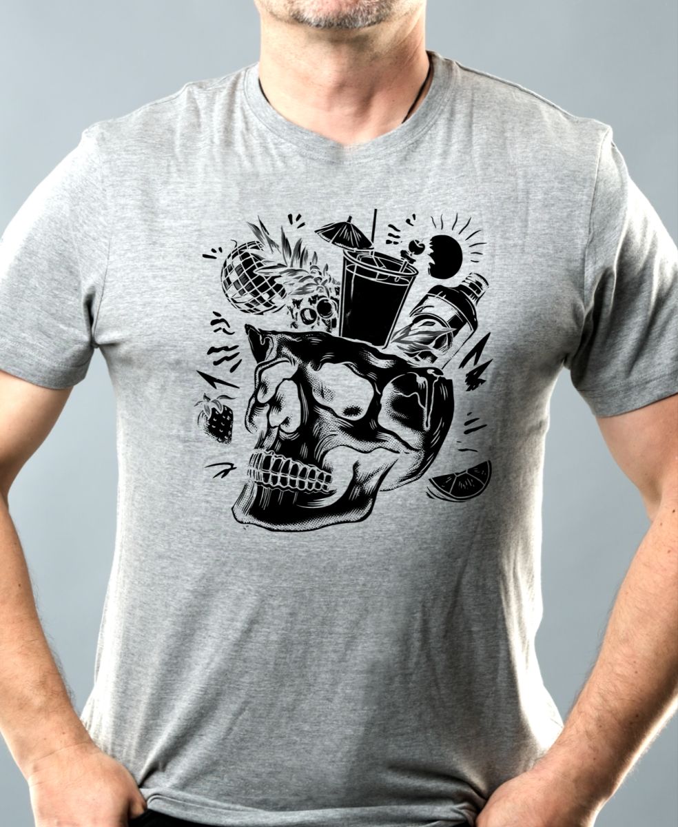 Párty v hlavě, lebka, V2, černý tisk. Design, který v barevné i černobílé verzi jasně říká, že nuda ve vašem slovníku nemá místo. Ideální kousek pro rebely, co žijí naplno až do morku kostí.