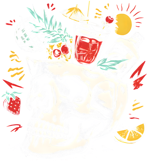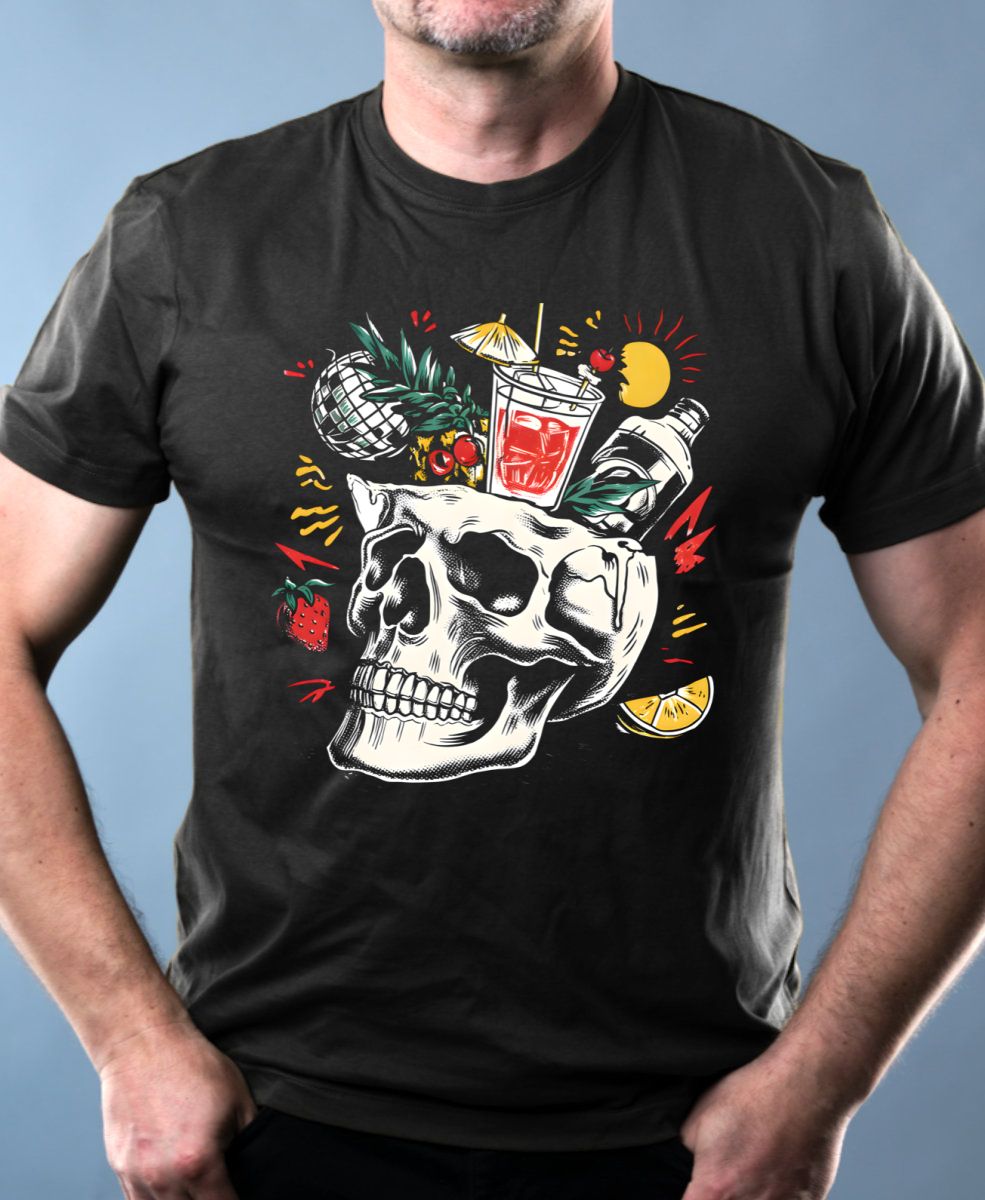 Párty v hlavě, lebka, V2.  Design, který v barevné i černobílé verzi jasně říká, že nuda ve vašem slovníku nemá místo. Ideální kousek pro rebely, co žijí naplno až do morku kostí.