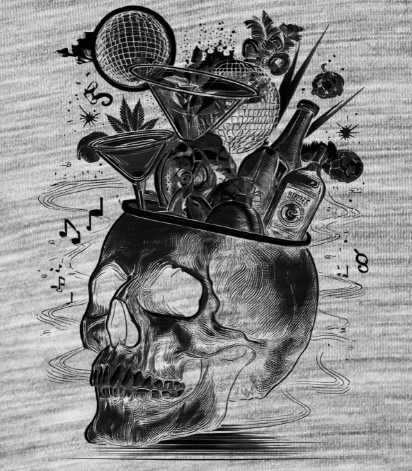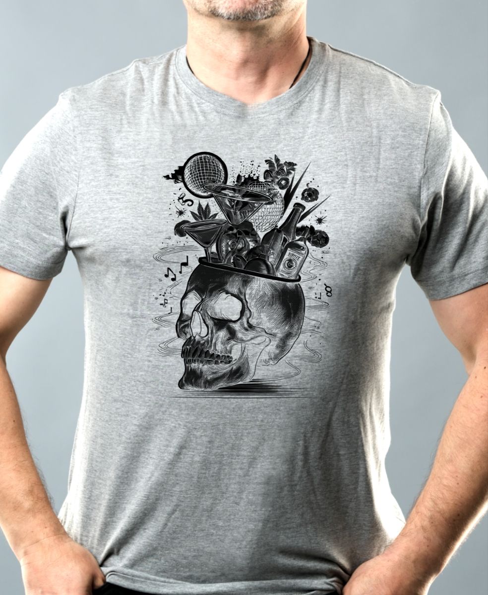 Párty v hlavě, lebka, V3, černý tisk. Design, který v barevné i černobílé verzi jasně říká, že nuda ve vašem slovníku nemá místo. Ideální kousek pro rebely, co žijí naplno až do morku kostí.