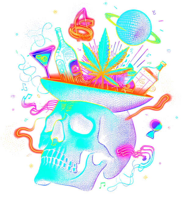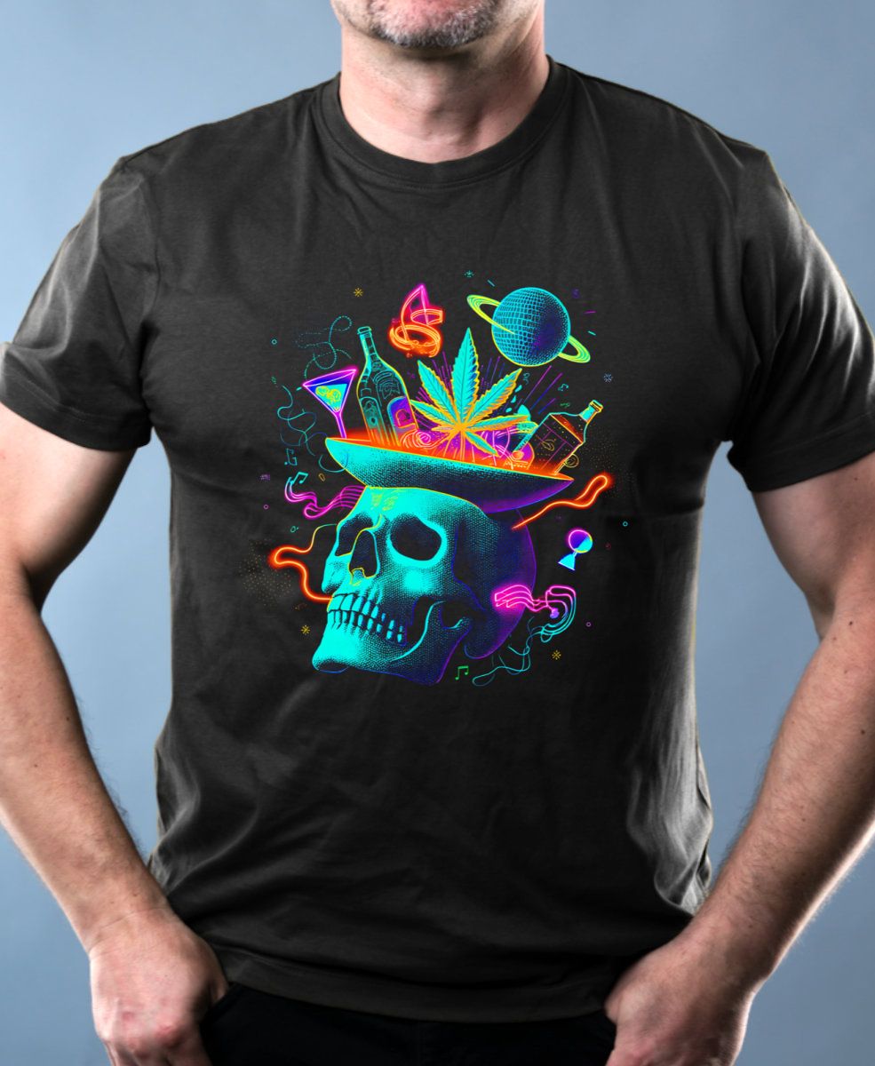 Párty v hlavě, lebka.  Design, který v barevné i černobílé verzi jasně říká, že nuda ve vašem slovníku nemá místo. Ideální kousek pro rebely, co žijí naplno až do morku kostí.