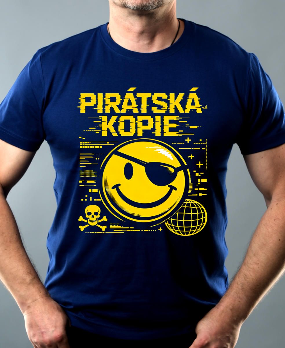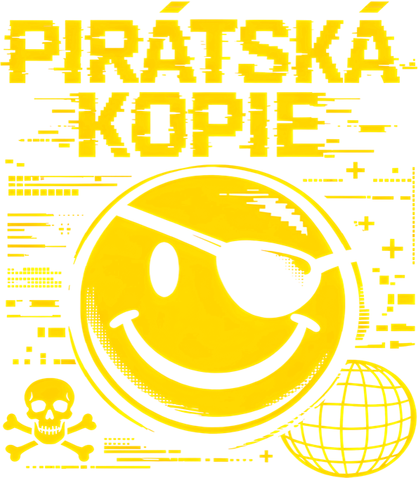 Pirátská kopie, V1. Drsný design lebky s páskou přes oko v digitálním glitch stylu s varovnými symboly. Ideální pro milovníky kyberpunkové estetiky a rebelské módy.