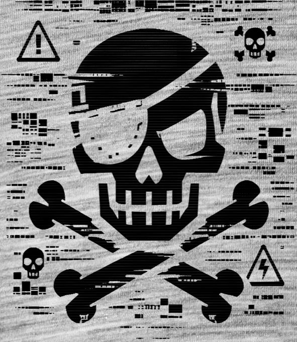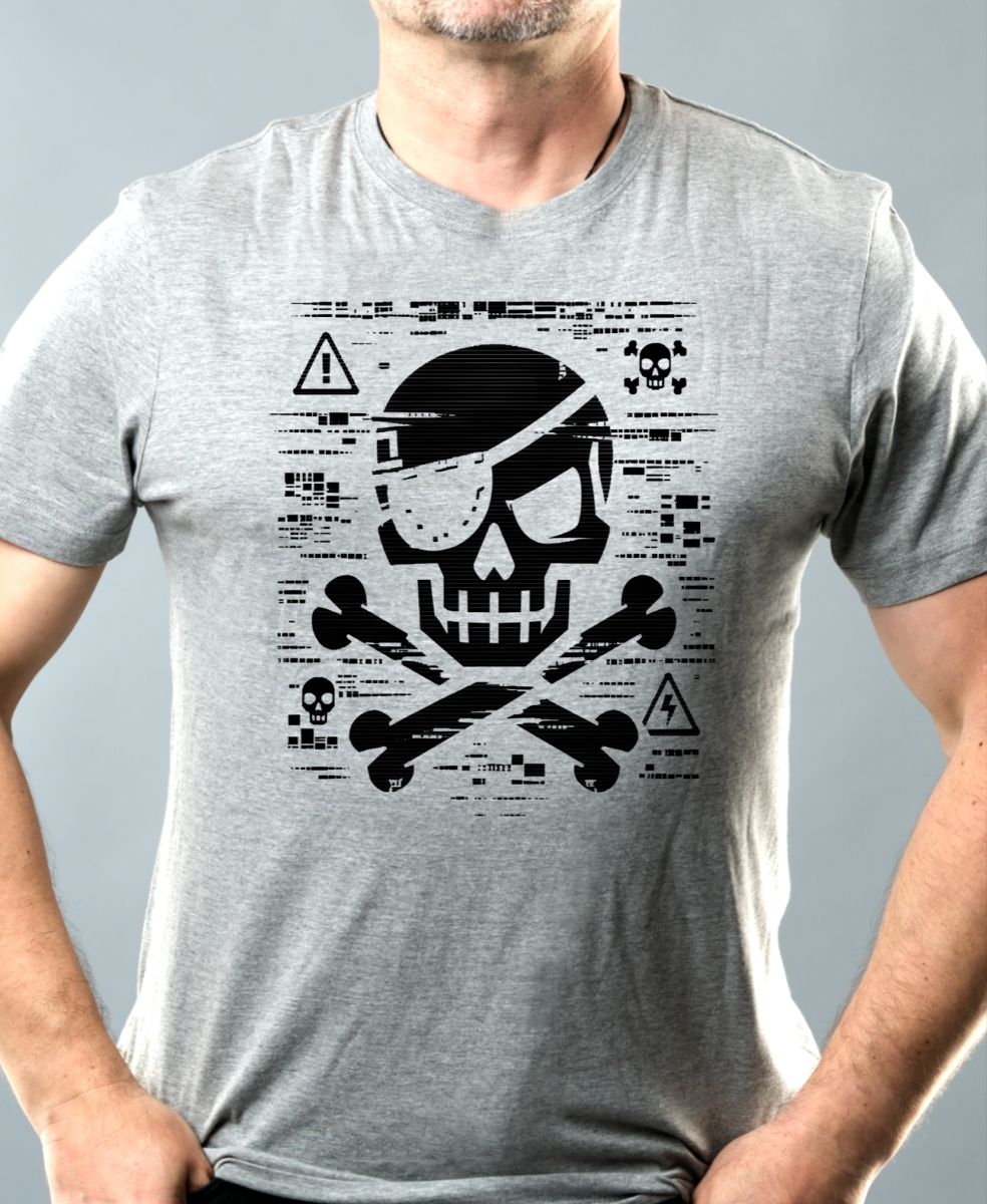 Pirátská kopie, V2, černý tisk. Drsný design lebky s páskou přes oko v digitálním glitch stylu s varovnými symboly. Ideální pro milovníky kyberpunkové estetiky a rebelské módy.