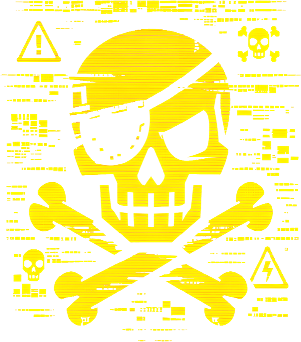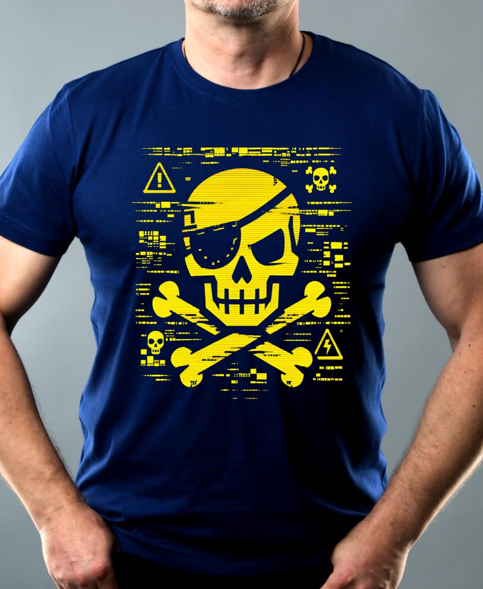 Pirátská kopie, V2. Drsný design lebky s páskou přes oko v digitálním glitch stylu s varovnými symboly. Ideální pro milovníky kyberpunkové estetiky a rebelské módy.