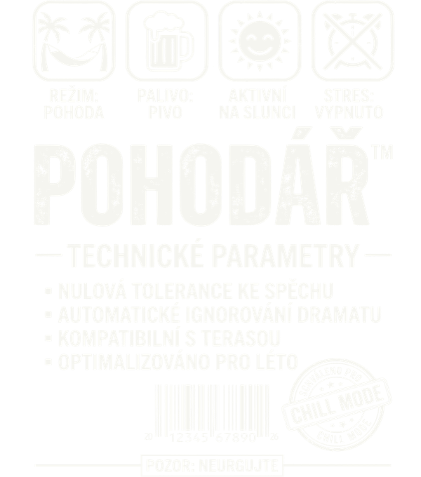Pohodář, bílý potisk. Proč se stresovat, když můžete přepnout do chill režimu? Vtipné triko ve stylu technického štítku pro všechny flegmatiky a milovníky klidu, jejichž hlavním palivem je pivo a vyznačují se absolutní nulovou tolerancí ke spěchu. Pozor: Neurgujte!