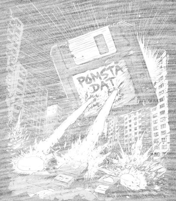 Pomsta dat, V2, bílý tisk. Apokalyptický retro nářez pro všechny ajťáky a pamětníky. Motiv ukazuje obří rozzuřenou disketu, která pomocí ničivých laserů likviduje moderní flashky a mění město v naprosté trosky. Nápis Pomsta dat na štítku jasně varuje, že staré technologie se vrací s obrovským úderem. Ať už je tvým denním chlebem práce v serverovně nebo tě obklopuje jen betonová městská krajina, s tímhle kouskem dáš jasně najevo, že klasickým zálohám se zkrátka nic nevyrovná.