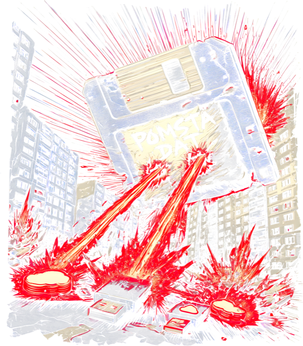 Pomsta dat, V2. Apokalyptický retro nářez pro všechny ajťáky a pamětníky. Motiv ukazuje obří rozzuřenou disketu, která pomocí ničivých laserů likviduje moderní flashky a mění město v naprosté trosky. Nápis Pomsta dat na štítku jasně varuje, že staré technologie se vrací s obrovským úderem. Ať už je tvým denním chlebem práce v serverovně nebo tě obklopuje jen betonová městská krajina, s tímhle kouskem dáš jasně najevo, že klasickým zálohám se zkrátka nic nevyrovná.