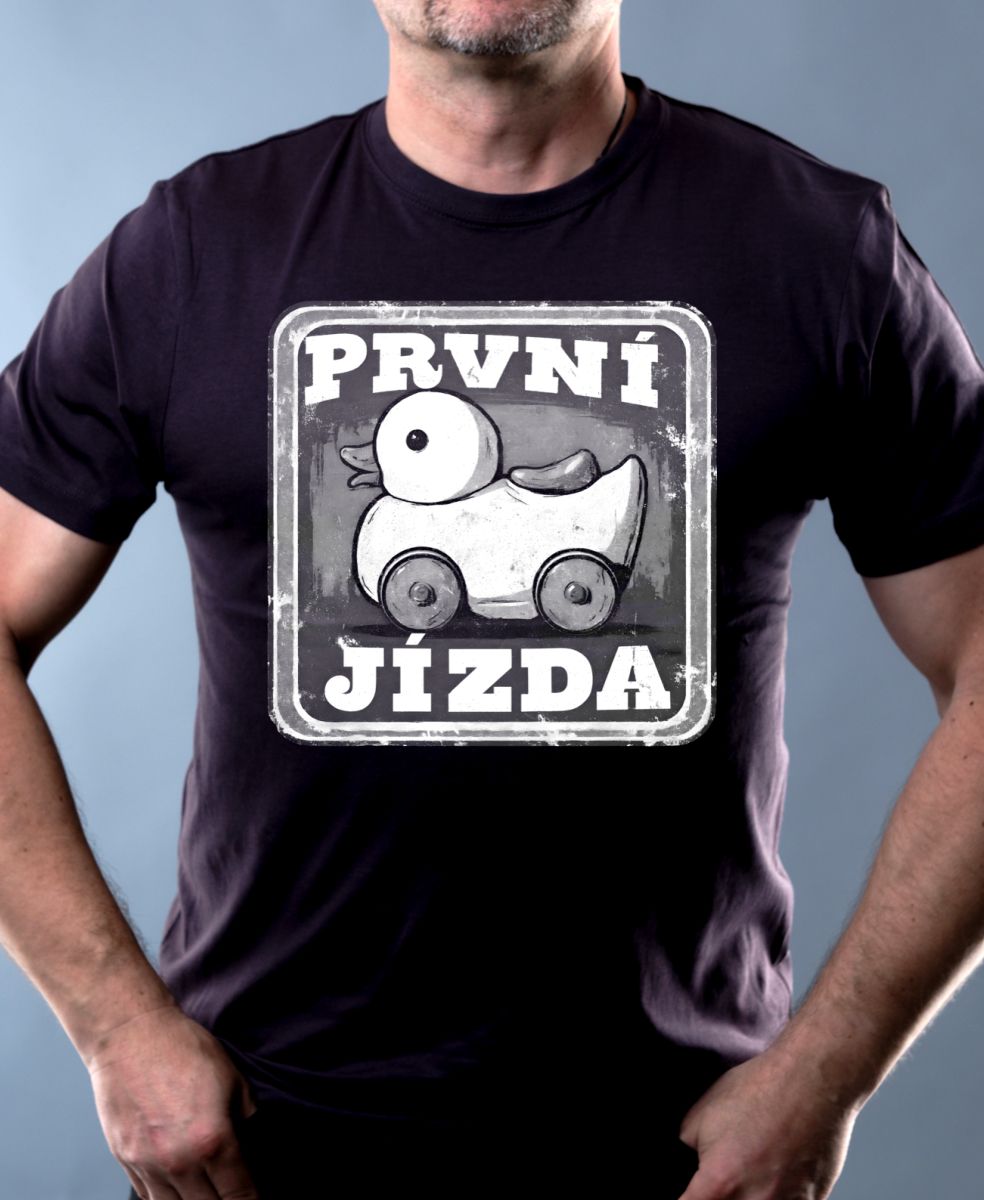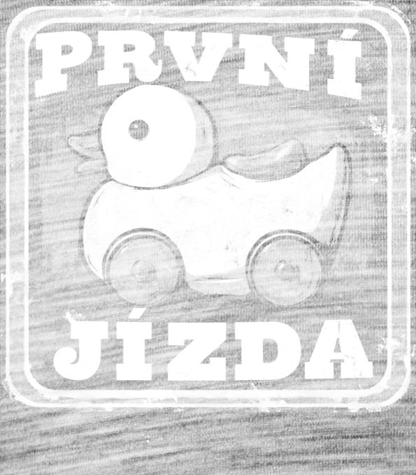První jízda, bílý potisk. Roztomilá kačenka na kolečkách ve stylu staré, ošoupané plechové cedule. Skvělý dárek z recese pro čerstvé majitele řidičáku, instruktory autoškoly nebo jako nostalgická vzpomínka na dětství.
