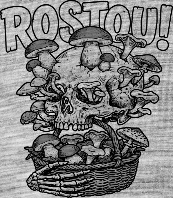 Rostou!, černý tisk. Ultimátní kousek pro zapálené houbaře s pořádným smyslem pro černý humor. Temnější, ale o to vtipnější motiv lebky, kterou skrz naskrz prorůstají hříbky.  Dokonalý dárek pro každého, kdo by v lese klidně i nechal kosti, jen aby našel ten největší pravák. Tričko, mikina, kšiltovka, zástěra, tílko, hrnek, půllitr, plechový hrneček