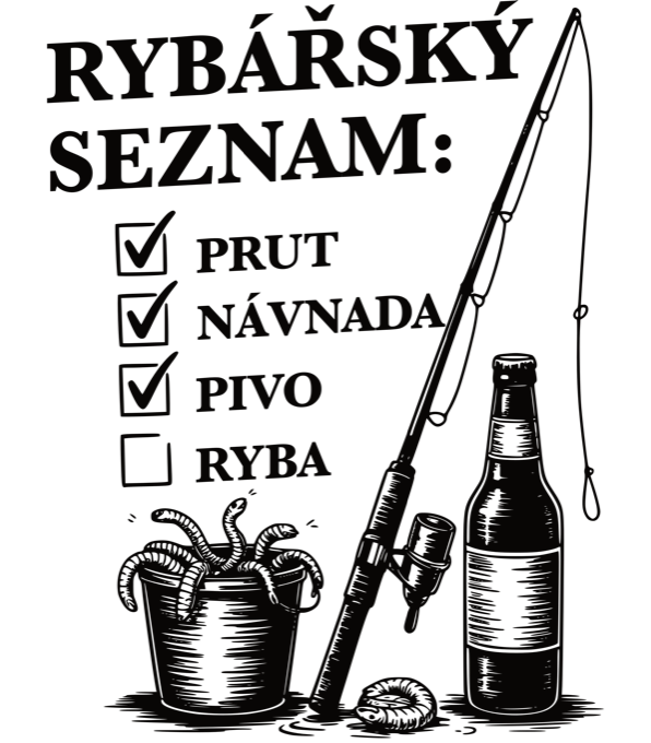 Rybářský seznam, černý potisk. Každý rybář ví, že pořadí je klíčové. Je to snadné: Prut, nástraha, PIVO… a pak možná i ta ryba. Tričko, mikina, kšiltovka, zástěra, tílko, hrnek, půllitr, plechový hrneček.