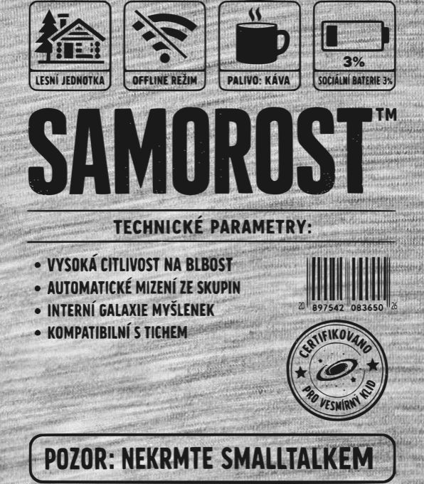 Samorost, černý potisk. Návod k použití pro každého správného introverta. Pokud máte neustále vybitou sociální baterii, k přežití potřebujete kávu, nesnášíte zbytečné tlachání a nejlépe je vám někde v lese v offline režimu, tohle triko řekne všechno za vás. Dokonalé varování pro okolí.