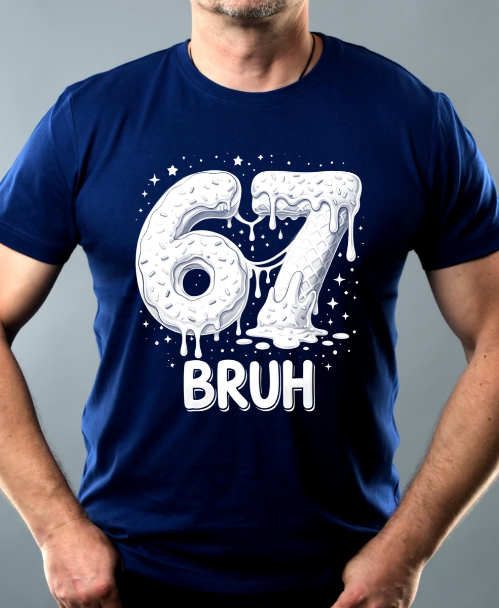 Six Seven, Glitch, Bruh tisk. Ultimátní “brainrot” kombinace: číslo 67 jako sladkosti a k tomu nápis “BRUH”. Tričko, mikina, kšiltovka, zástěra, tílko.