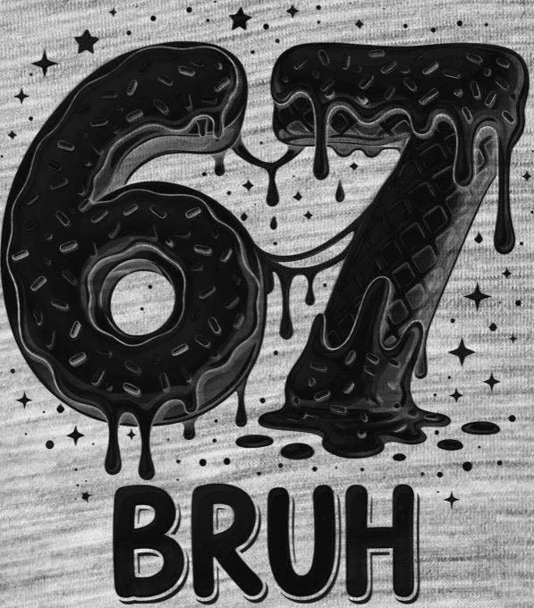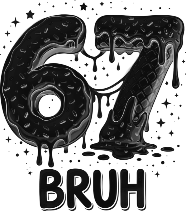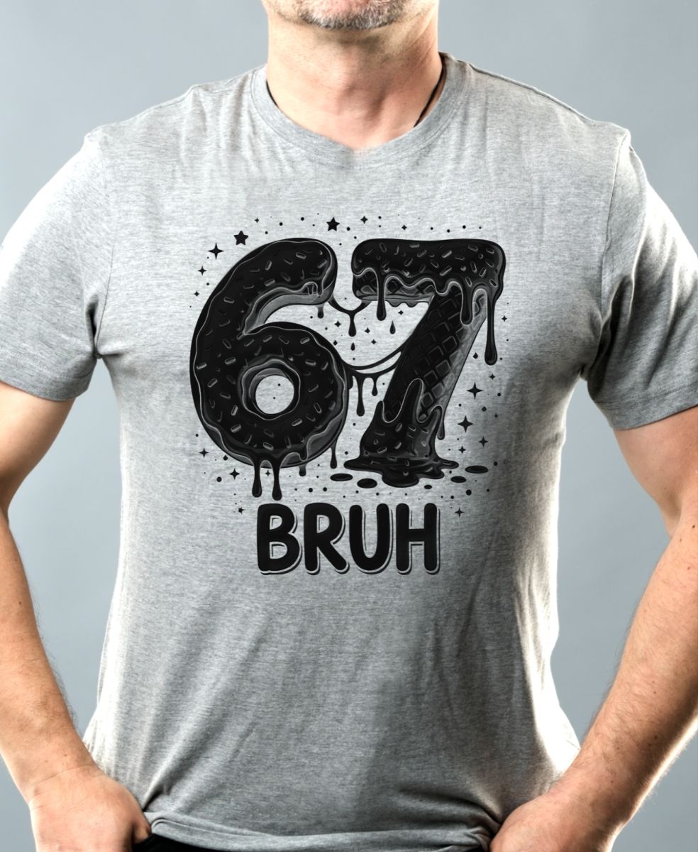 Six Seven, Bruh, černý tisk. Ultimátní “brainrot” kombinace: číslo 67 jako sladkosti a k tomu nápis “BRUH”.