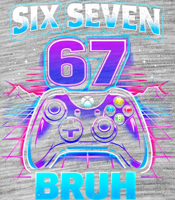 Six seven bruh gaming, V1. Stylový retro motiv pro všechny gamery, kteří milují estetiku 80. let a neonové barvy v modrofialových odstínech. Ideální kousek pro oslavu narozenin nebo pro milovníky vtipného herního slangu.