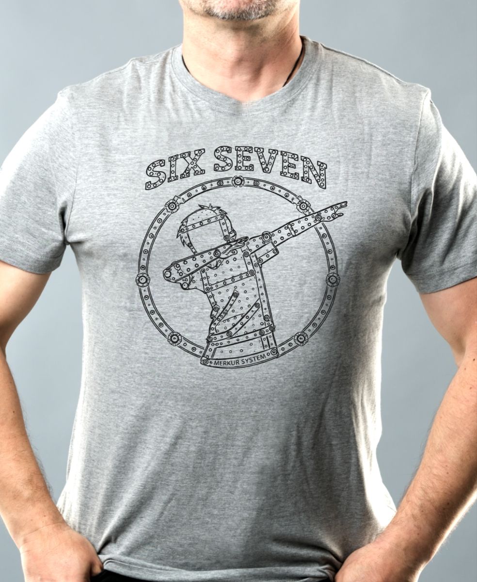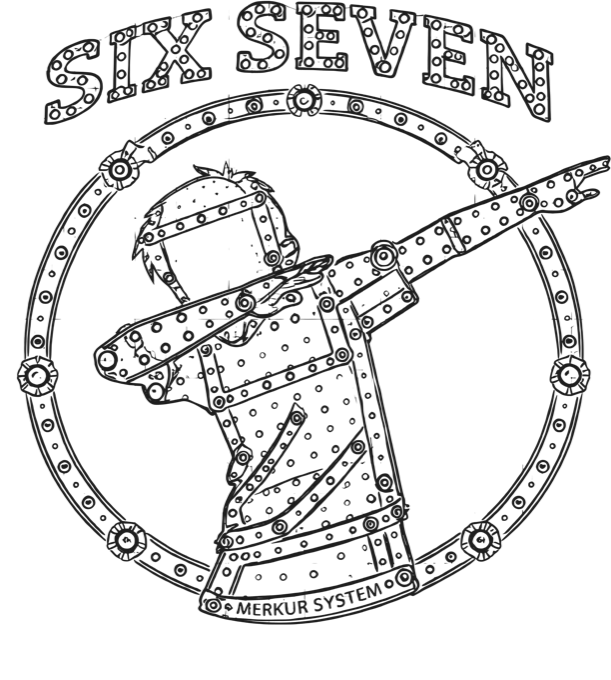 Six Seven, stavebnice, černý tisk. Originální spojení taneční figury dab s legendární kovovou stavebnicí Merkur. Postava složená z děrovaných pásků a šroubků potěší malé stavitele i fanoušky technického retro stylu.