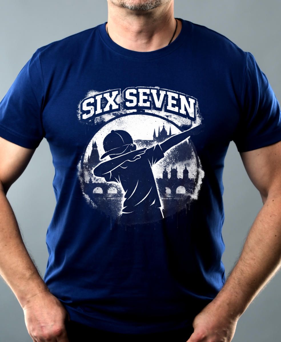 Six Seven, urban, bílý tisk. Cool streetový motiv s chlapcem v kšiltovce dělajícím dab na pozadí městského panoramatu. Grunge styl a výrazný nápis dodávají designu moderní nádech ideální do školy i na ven. Tričko, mikina, kšiltovka, zástěra, tílko.