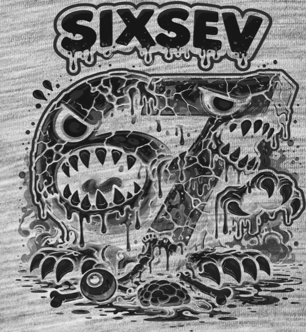 Sixsev horror 67, černý tisk. Brutální a děsivá verze čísel 6 a 7, která se proměnila v krvelačná monstra. Detailní hororová ilustrace s nápisem Sixsev, plná zubů, očí a kostí pro fanoušky drsnějšího stylu a zombie tématiky.