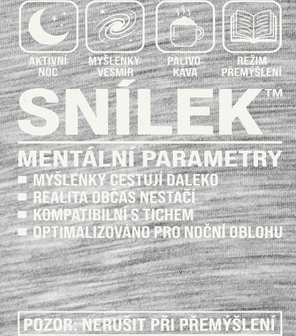 Snílek, bílý potisk. Pro všechny noční sovy a hloubavé duše, kterým je občas pozemská realita tak trochu těsná. Pokud jedete na kávu, ožíváte v noci a vaše myšlenky neustále bloudí někde ve vesmíru, tohle triko je váš oficiální technický průkaz. Varování mluví za vše: Nerušit při přemýšlení!