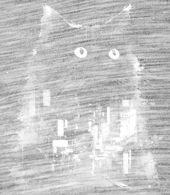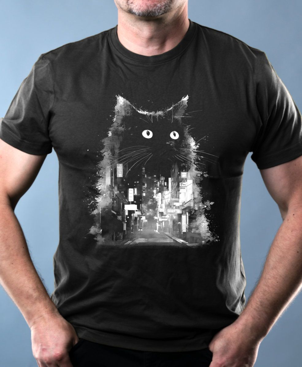 Strážkyně nočního města, bílý potisk. Když se město ponoří do tmy , tyhle oči vidí úplně všechno. Magické spojení kočičí elegance a pulzujícího kyberpunkového velkoměsta pro milovníky noční atmosféry.