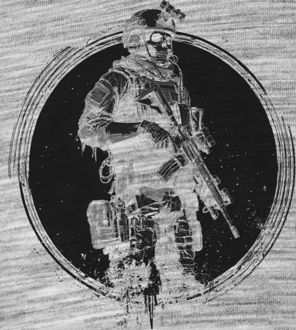 Taktický kostlivec, černý tisk. Smrt má novou uniformu. Detailní ilustrace nemrtvého operátora v plné polní, který je připraven na misi i po životě. Motiv zasazený do krvavě rudého kruhu osloví každého fanouška military stylu, airsoftu a hardcore taktických her.