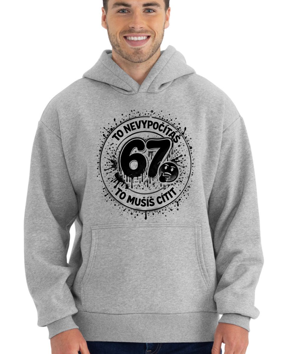 To nevypočítáš, six seven, černý tisk. Výrazný design s číslem 67 a vtipnou hláškou „To nevypočítáš, to musíš cítit“. Energický motiv s efektem slizu a přemýšlivým smajlíkem.