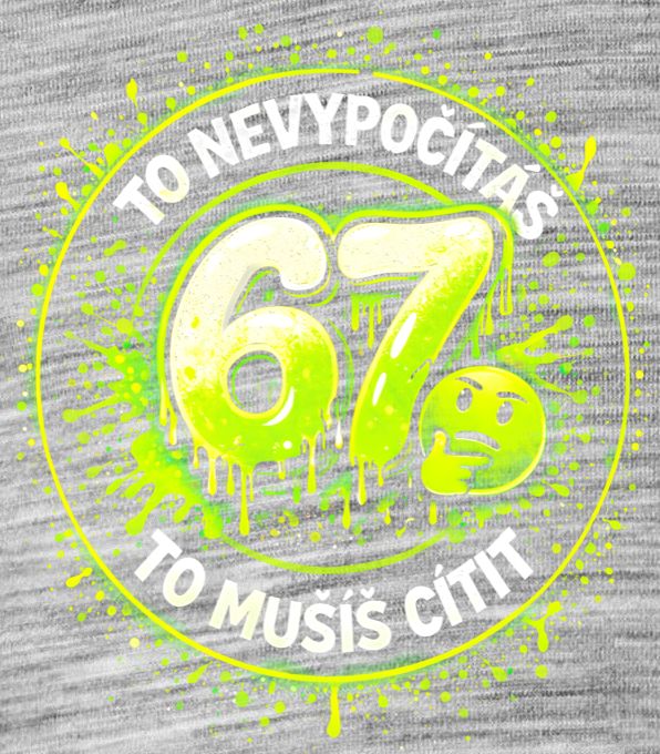 To nevypočítáš, six seven. Výrazný design s číslem 67 a vtipnou hláškou „To nevypočítáš, to musíš cítit“. Energický motiv s efektem slizu a přemýšlivým smajlíkem.