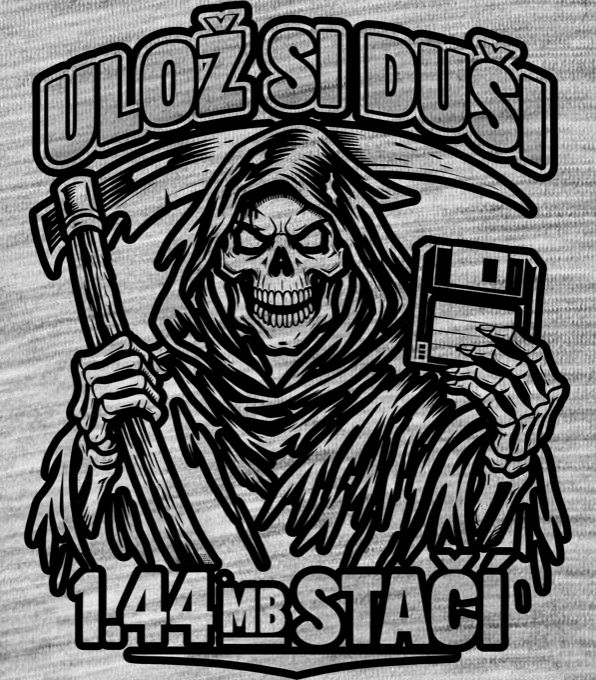 Ulož si duši, černý tisk. Vtipný retro motiv pro všechny IT nadšence a pamětníky. Smrťák s kosou v jedné ruce a legendární 3,5″ disketou v druhé přináší jasný vzkaz: na tvou duši bohatě stačí kapacita 1.44 MB. Skvělý geekovský kousek s výrazným růžovým textem, který zaručeně pobaví každého ajťáka, programátora nebo milovníka devadesátkových technologií.
