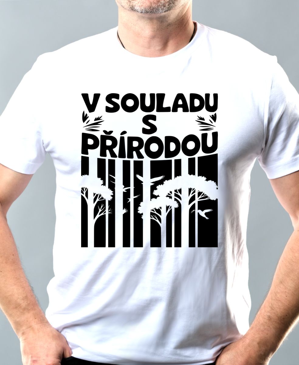 V souladu s přírodou, černý potisk. Decentní a stylový motiv, kde se typografie prolíná se siluetami stromů a ptáků. Ideální kousek pro milovníky lesa, turistiky a všechny, kteří nejraději utíkají do divočiny.