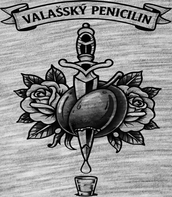Valašský penicilin, černý potisk. Tradiční medicína ze srdce Moravy ve stylovém old-school tattoo designu. Správná švestka, ostrá dýka a kapka toho pravého tekutého zlata vyřeší každý neduh spolehlivěji než doktor. Ideální kousek pro všechny hrdé Valachy a milovníky poctivé pálenky.