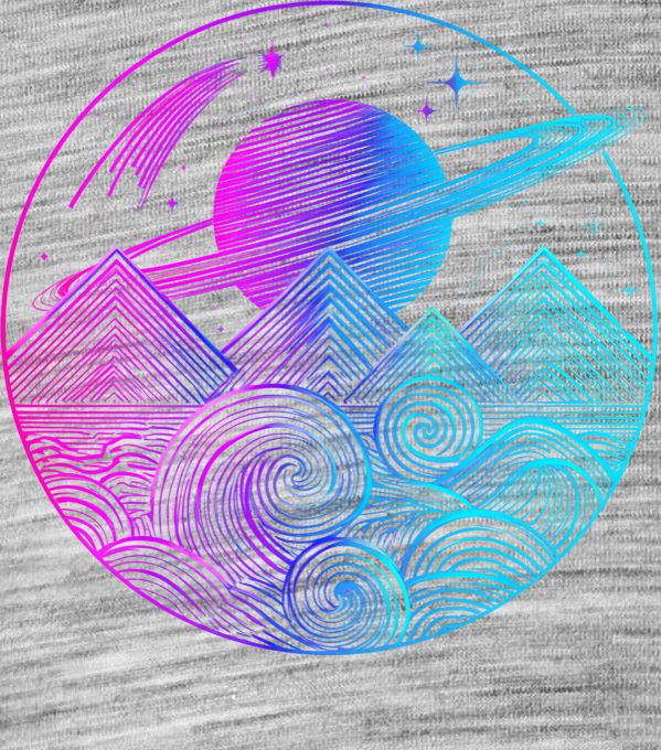 Vesmírná krajina. Nádherný line art motiv, který tě okamžitě přenese do jiných světů. Magická mimozemská krajina tvořená stylizovanými vlnami a horskými štíty, nad kterými se tyčí obrovská prstencová planeta a padající hvězda. Celý kruhový design je vyveden v úžasném neonovém gradientu od růžové po tyrkysovou. Perfektní a stylový kousek pro všechny snílky, milovníky vesmíru a synthwave estetiky. Tričko, tílko, mikina, kšiltovka, zástěra, hrnek, plechový hrnek, termoska, půllitr, kraťasy, polštář.