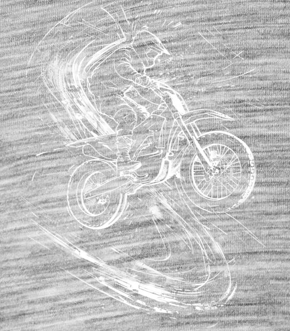 Vítr v sedle, bílý tisk. Motorkář a jeho stroj tvoří dokonalou akční spirálu energie.  Motiv pro ty, kteří milují nespoutaný adrenalin a nenechají se ničím zpomalit.