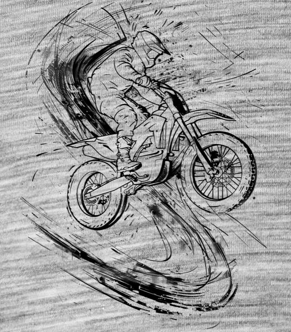 Vítr v sedle, černý tisk. Motorkář a jeho stroj tvoří dokonalou akční spirálu energie.  Motiv pro ty, kteří milují nespoutaný adrenalin a nenechají se ničím zpomalit.
