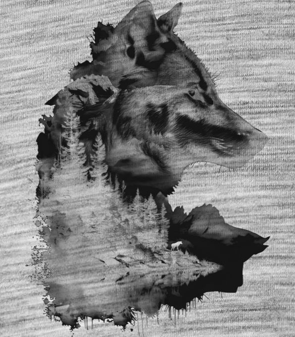 Vlk v horách, černý potisk.Tento design s dvojexpozicí elegantně kombinuje portrét vlka s dechberoucí horskou krajinou