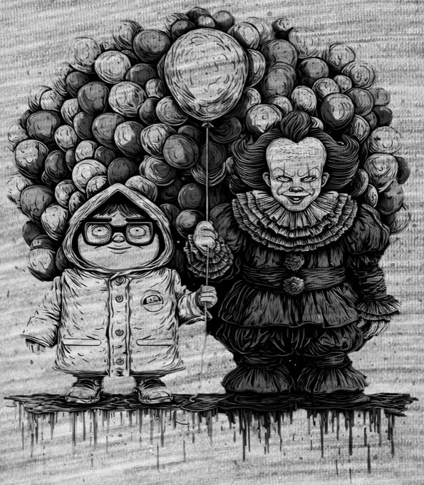 Všichni se vznášíme, černý tisk. Co se stane, když se spojí ten nejroztomilejší animák s kultovním hororem? Všichni se budeme vznášet! Temně vtipný mashup s děsivým klaunem, žlutou pláštěnkou a hromadou barevných balónků. Ideální kousek pro milovníky popkultury, kteří se rádi bojí, ale milují černý humor. Tričko, mikina, kšiltovka, zástěra, tílko, hrnek, půllitr, plechový hrneček