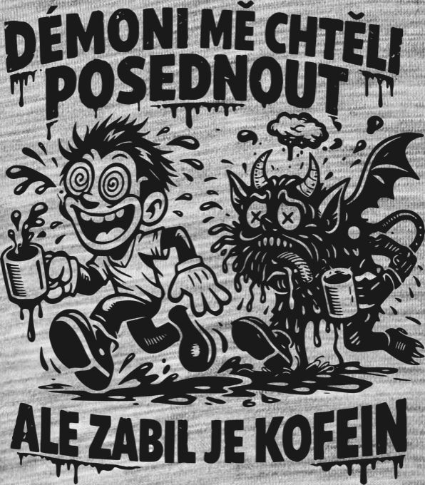 Zabil je kofein, černý tisk . Zapomeňte na svěcenou vodu, ten nejlepší exorcismus začíná poctivým dvojitým espressem. Zábavný komiksový motiv pro všechny kofeinové závisláky, kteří mají tolik energie, že z toho i bytosti temnot chytají infarkt.