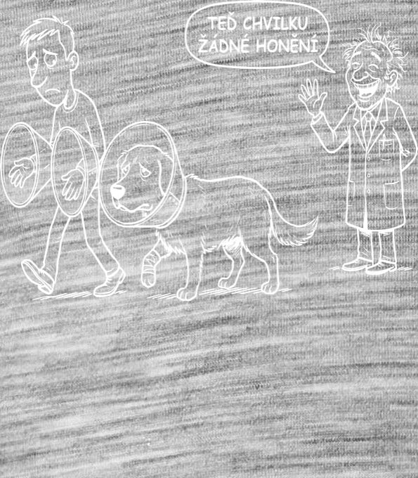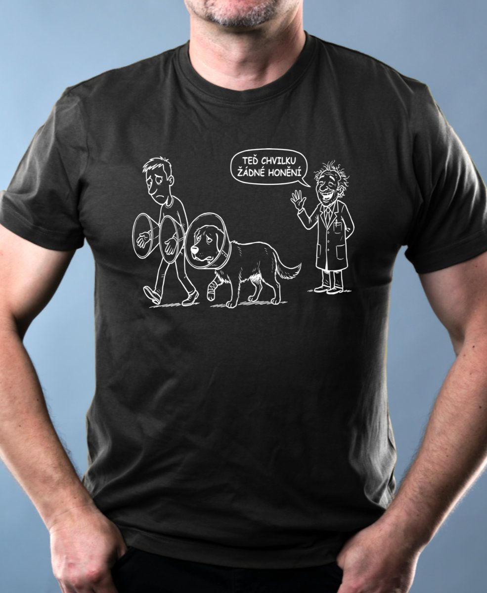 Žádné honění, bílý potisk. Drsnější kreslený humor ze života pejskařů a jejich mazlíčků po návštěvě veteriny. Tento motiv s vtipnou pointou zaručeně pobaví každého majitele psa se smyslem pro černý humor.. Tričko, tílko, mikina, kšiltovka, zástěra.