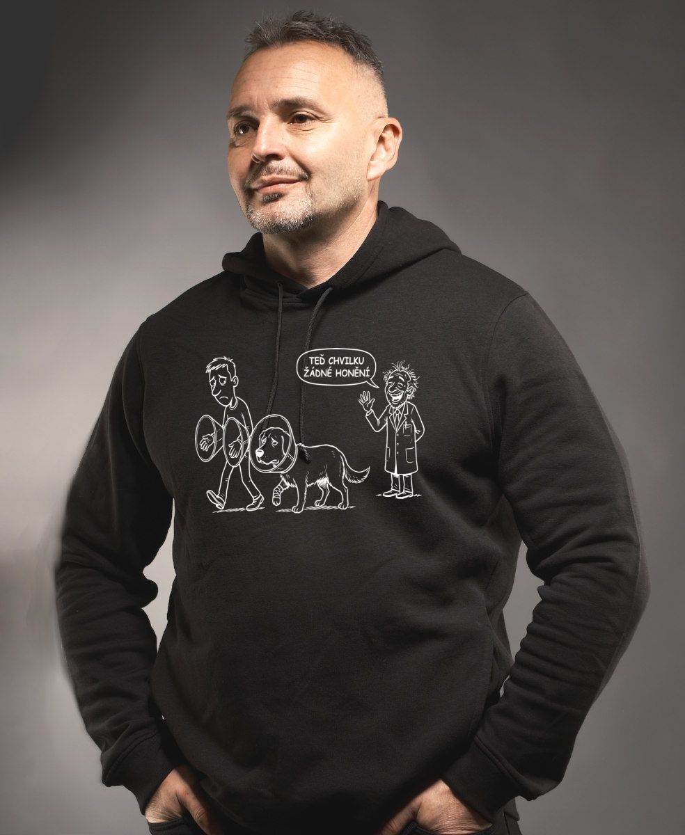 Žádné honění, bílý potisk. Drsnější kreslený humor ze života pejskařů a jejich mazlíčků po návštěvě veteriny. Tento motiv s vtipnou pointou zaručeně pobaví každého majitele psa se smyslem pro černý humor.. Tričko, tílko, mikina, kšiltovka, zástěra.