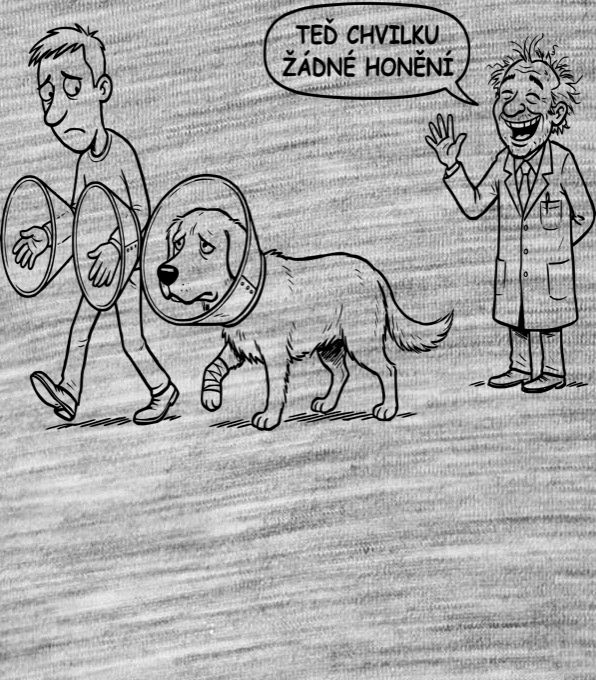 Žádné honění, černý potisk. Drsnější kreslený humor ze života pejskařů a jejich mazlíčků po návštěvě veteriny. Tento motiv s vtipnou pointou zaručeně pobaví každého majitele psa se smyslem pro černý humor.