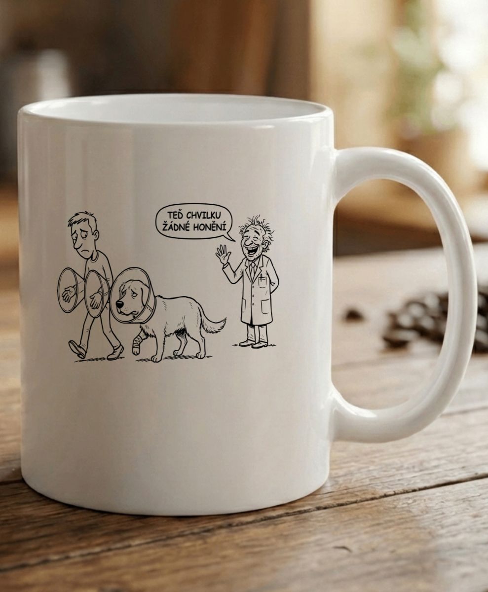 Žádné honění, černý potisk. Drsnější kreslený humor ze života pejskařů a jejich mazlíčků po návštěvě veteriny. Tento motiv s vtipnou pointou zaručeně pobaví každého majitele psa se smyslem pro černý humor.