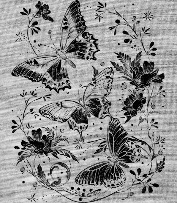 Zahrada motýlích křídel, černý potisk. Motýli jsou okvětní lístky, které se naučily létat. Překrásná, detailní grafika plná motýlů a kvítí v jemných vintage tónech.