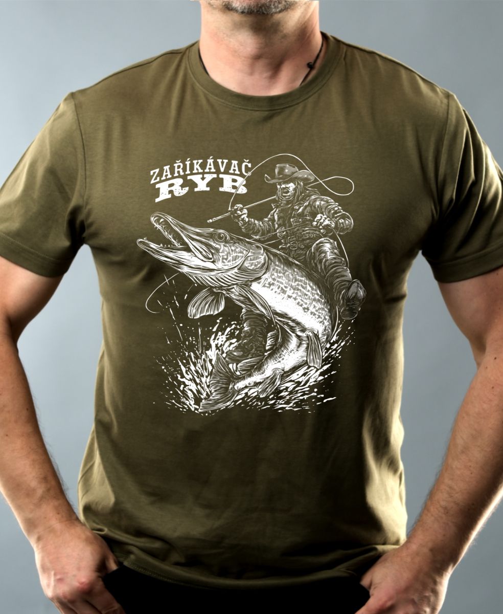 Zaříkávač ryb, bílý potisk. Někdo ryby chytá, někdo na nich rovnou jezdí. Motiv pro rybáře, kteří mají u vody takovou autoritu, že jim i ty největší štiky zobou z ruky. Tričko, tílko, mikina, kšiltovka, zástěra, hrnek, plechový hrnek, termoska, půllitr, kraťasy, polštář.