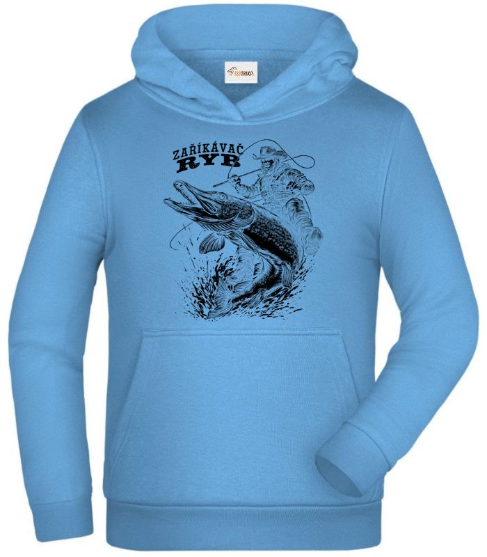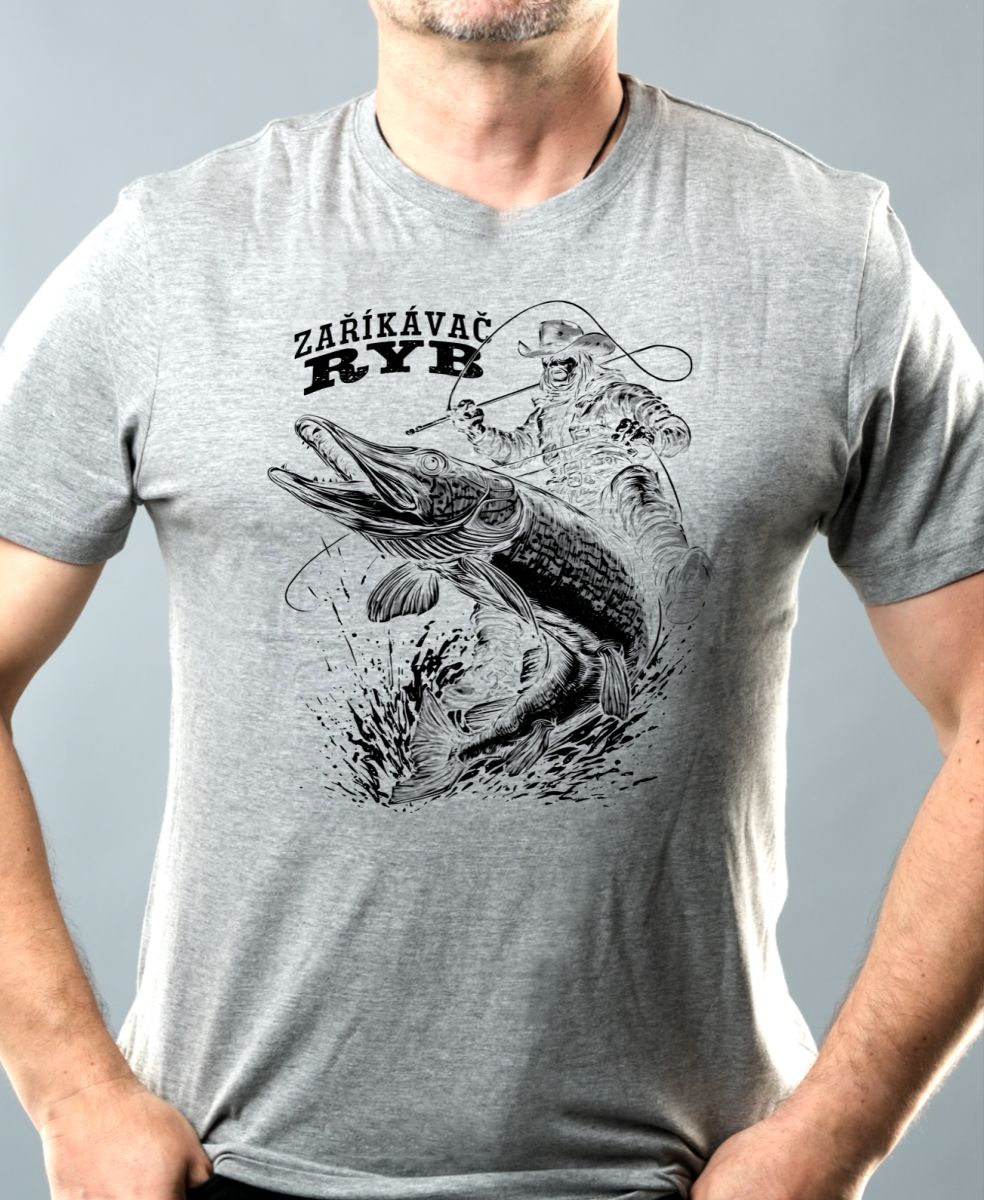 Zaříkávač ryb, černý potisk. Někdo ryby chytá, někdo na nich rovnou jezdí. Motiv pro rybáře, kteří mají u vody takovou autoritu, že jim i ty největší štiky zobou z ruky. Tričko, mikina, kšiltovka, zástěra, tílko, hrnek, půllitr, plechový hrneček.