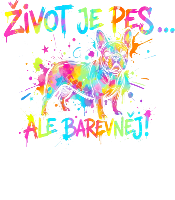 Život je pes ale barevnej. Veselý a pozitivní motiv pro všechny pejskaře, kteří berou život s nadhledem. Design s francouzským buldočkem v zářivých akvarelových barvách a vtipným nápisem „Život je pes… ale barevnej!“. Skvělý kousek, který zaručeně zvedne náladu a rozzáří každý den. Ideální triko pro majitele buldočků a milovníky energických potisků.
