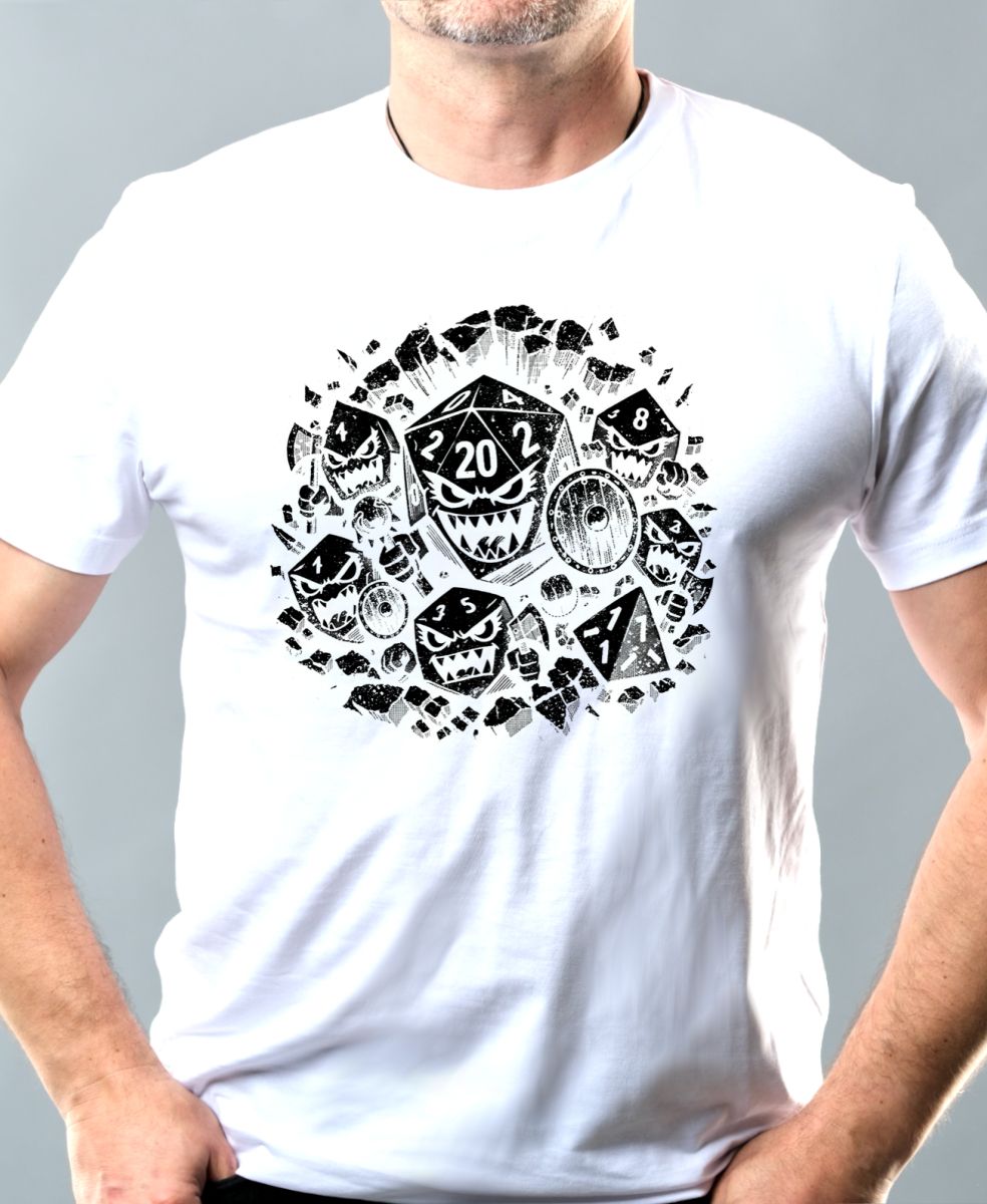 Zuřivé RPG kostky, černý tisk. Když se hod kostkou trochu zvrtne a hra ožije víc, než jste čekali. Tento dravý design s oživlými hracími kostkami je perfektní výbavou pro každého fanouška Dračího doupěte a stolních RPG her.